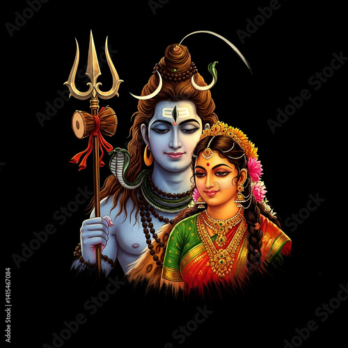 Detailed illustration of Shiva with a cobra around his neck, holding a trishul, and Parvati in a green and red sari with intricate gold ornaments