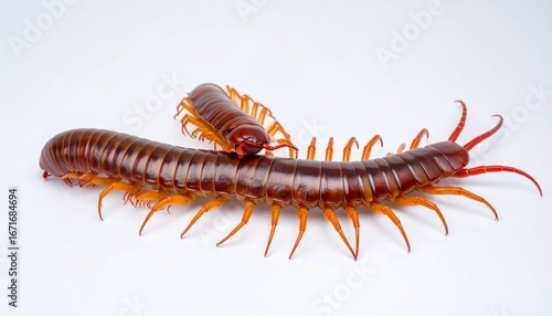 Detailed image of a reddish-brown centipede with segmented body and numerous legs, curved in an S-shape on a white background