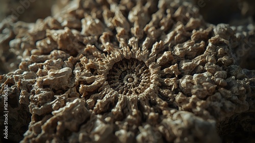 Detailed macro shot of a dried, rugged, textured stone with a natural spiral pattern. Reminiscent of a fossil or ancient desert formation