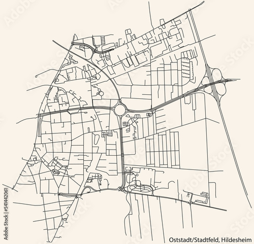 Detailed navigation black lines urban street roads map of the OSTSTADT-STADTFELD MUNICIPALITY of the German regional capital city of Hildesheim, Germany on vintage beige background