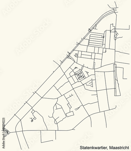 Detailed navigation black lines urban street roads map of the STATENKWARTIER NEIGHBORHOOD of the Dutch regional capital city Maastricht, Netherlands on vintage beige background