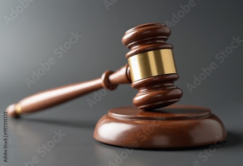 Detailed photo of a wooden gavel with a metallic gold band and matching sound block