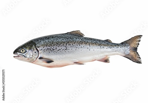 Detailed scales and natural fish colors are showcased in a side view of a whole, raw salmon against a white background