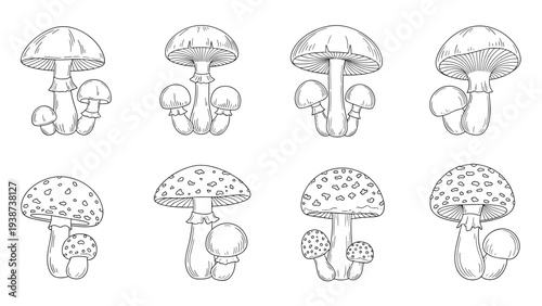 Detailed set of eight distinct line art mushroom illustrations, showcasing various types and clusters, perfect for botanical studies, nature designs, or educational materials.