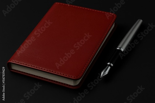 Detailed shot of a crimson leather journal accompanied by a fountain pen against a dark backdrop