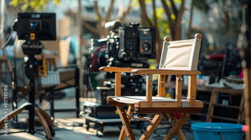 Detailed shot of a director's chair set amidst the film set equipment, highlighting the chair's unique features, isolated for focus
