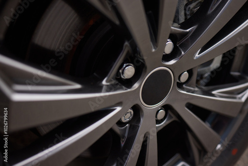Detailed shot of a sleek black and silver alloy wheel on a motor vehicle