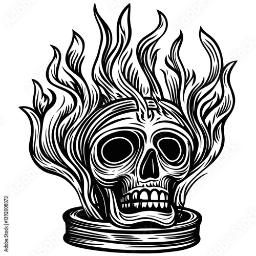 engraving, skull, flames, fire, vector, illustration, graphic, art, design, burning, horror, skittish, death, symbol, artwork, creative, scarey, grisly, aesthetic, monochrome, line, tattoo, edgy, bold, visual, unique, striking, dramatic, gothic, black, white, atmospheric, trendy, modern, print, poster, decoration, icon, element