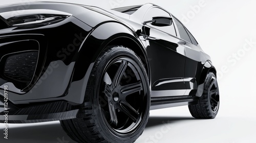 Detailed SUV front-end mockup showcasing a blend of sporty curves and robust wheels, perfect for transparent backgrounds.