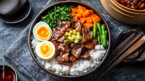 detailed, top, view, steamed, rice, braised, pork meat, leg, boiled, egg, stewed, vegetable, subtile, smoky, aroma, soft, lighting, creating, clean, appetising, presentation, traditional, comforting, experiencing, food, meat, meal, dinner, plate, beef, chicken, salad, lunch, dish, cookery, vegetable, epicure, delicious, fried, healthy, sauce, eatery, stew, cooked, tomatoes, pepper, spicey