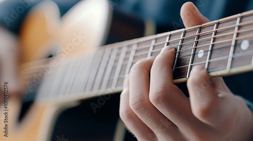 Detailed top-view close-up of an acoustic guitar, highlighting the fretboard, bridge, and strings, natural wood texture, soft ambient light creating depth