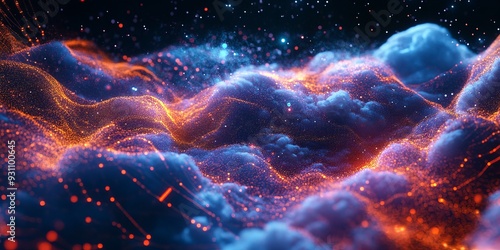 Detailed view of a cosmic cloud, infused with glowing energy lines and holographic data points, blending the beauty of space with technology