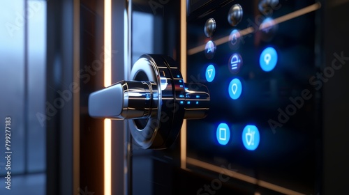 Detailed view of a digital door lock, focusing on the touchscreen interface and secure locking mechanism in a realistic setting