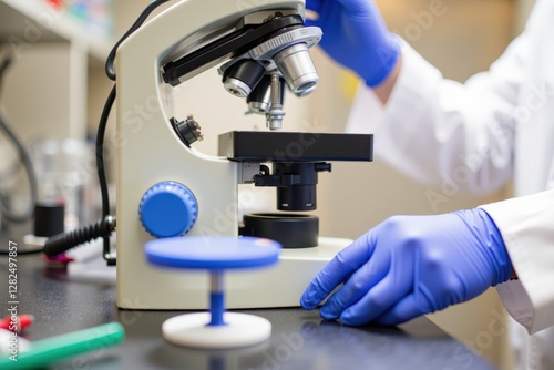 Detailed View of a Microscope in a Laboratory Setting with a Scientist in White Lab Coat and Blue Gloves Performing Research Analysis