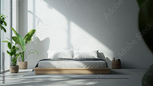Detailed view of a minimalist bedroom with a platform bed, minimal accessories, and a serene atmosphere