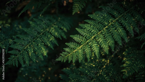Detailed view of fern leaves illuminated by light and shadow