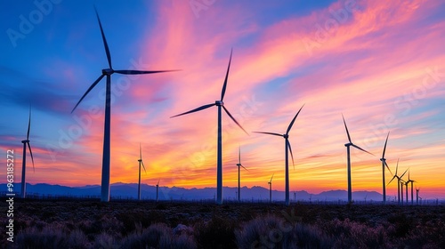 Detailed view of multiple wind turbines in a wind farm, with a focus on their tall towers and spinning blades, set against a dramatic sunset sky.