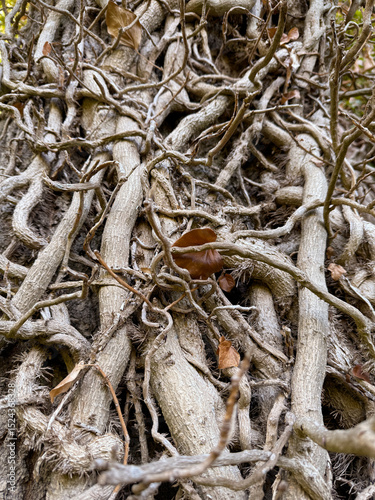 Detailed view of twisting tree roots, tangled vines and fallen autumn leaves.