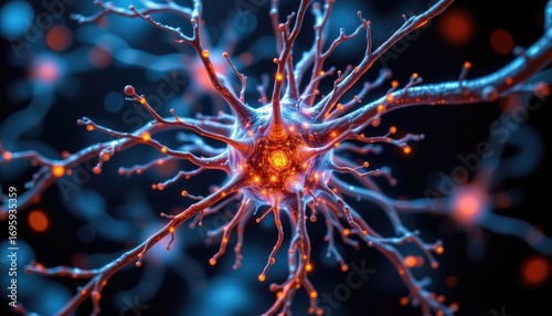 Detailed Visualization of a Neuron Cell with Dendrites and Axon in Vibrant Colors Representing Neural Networks