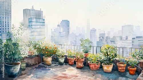 Detailed watercolor of a rooftop garden, potted plants, city skyline, soft morning mist ,Ultra-High Detail, Ultra-Realistic