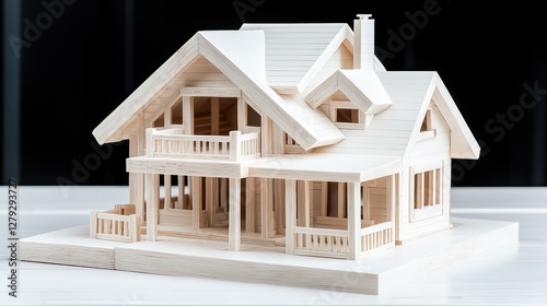 Detailed wooden house model on white surface, architectural design, interior, and exterior view. Potential use for real estate, home design inspiration, etc.
