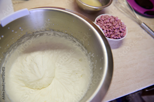 whipped cream, foam, glaze, organic, chocolate chips, confectionery, white, whipped, stainless steel, bowl, kitchen, worktop, utensil, ingredient, bakery, prepare, cook, making, cake, mousse, melting, cooking, raw, scale, topview, cookery, culinary, closeup, tasty, sugar, nourishment, energy, epicure, baking, delicious, epicure, confection, temptation, gastronomy, foodstuff, nourishment