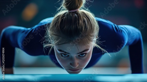 woman, athlete, press-ups, fitness, exercise, gymnast, sport, strength, physical exercise, training, gym, active, healthy, lifestyle, powerful, determined, focused, intense, concentration, discipline, effort, perseverance, dedication, bodybuilding, weightlift, athletic, muscle, strong, energy, girl, young, female, closeup, low angle, portrait, sporty, indoor, competition, dark, blue