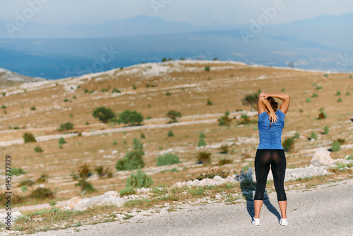 woman, stretching, athlete, fitness, exercise, training, health, recovery, muscle, outdoors, mountain, rocky, terrain, determination, stamina, endurance, flexibility, physical exercise, resilience, motivation, energy, vitality, strength, agility, routine, relaxation, sharpened, discipline, wellness, landscape, scenery, environment, fresh, air, sunrise, sunset, serene, peaceful, effort, commitment, achievement, balance, posture, unwind, stretch, dedication, power, athletic, run
