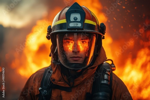determined firefighter in full gear striding towards camera orange flames reflecting off helmet visor smoky background