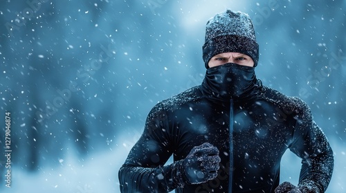 Determined Male Runner in Winter Apparel Battling Heavy Snow During Outdoor Exercise in a Cold and Gloomy Atmospheric Landscape