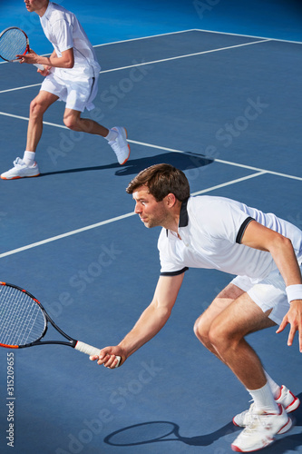 Determined young male tennis doubles players poised tennis rackets on tennis court