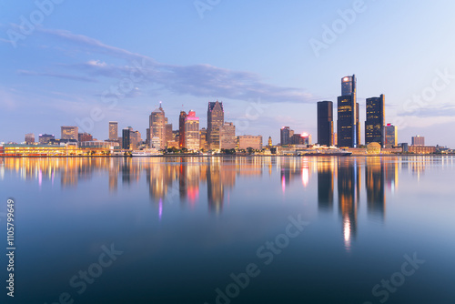 Detroit, Michigan, USA skyline at dawn on the Detroit River