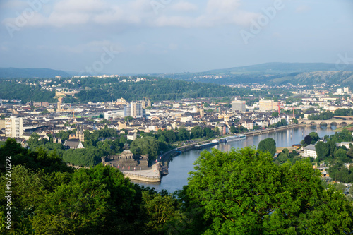 Deutsches Eck in Koblenz in Rheinland-Pfalz mit Blick auf Koblenz alstadt Panorama