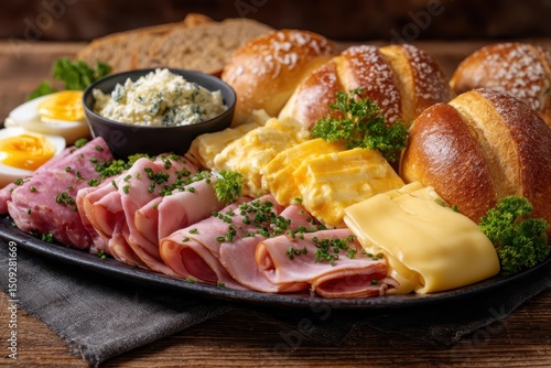 Deutsches Frühstück Wurst Käse Brötchen Frühstücksteller Ei Schinken Frühstücksbuffet Brotzeit Aufschnitt Frühstück klassisch Deftig Frühstücken Frühstück mit Brötchen Käseplatte Frühstück