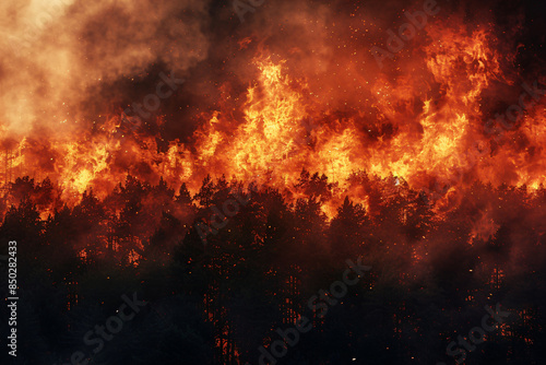 Devastating forest blaze engulfing trees, showcasing the destructive force of wildfires, suitable for studies on climate impact, ecological consequences, and disaster preparedness