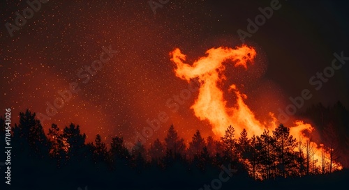 Devastating inferno engulfing a dark forest at night, casting an ominous glow against the smoky sky, portraying a powerful natural disaster with cinematic intensity and high contrast