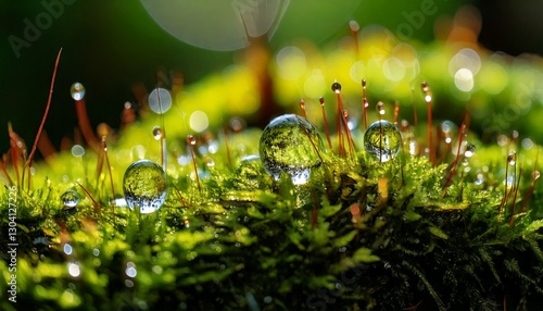 Dew Drops on Green Moss Reflecting Nature in a Macro Photography Close-Up