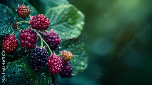 Dew Kissed Blackberries on a Bush with Dark Green Background and Copy Space