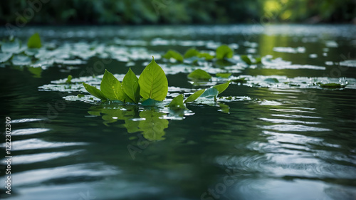 Dewdrops cling to green leaves, reflecting light above a serene pond surrounded by lush greenery, evoking calmness and nature's tranquility