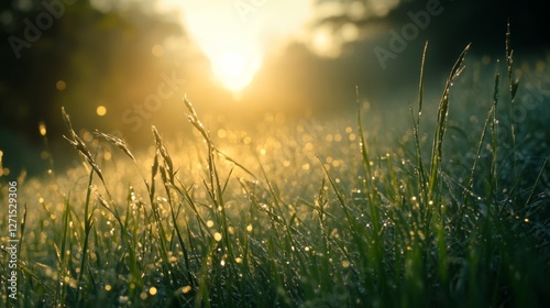 Dew-kissed grass at sunrise with sunlight streaming through blades