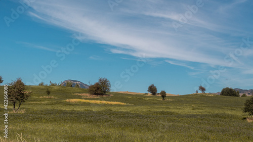 landscape, heaven, grass, field, nature, summer, meadow, cloud, blue, green, rural, farming, hill, farm, tree, country, mountain, land, pasture, countryside, horizon, view