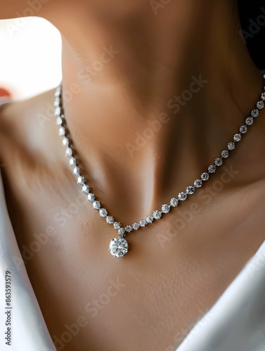 Diamond necklace on woman's neck at jewelry store