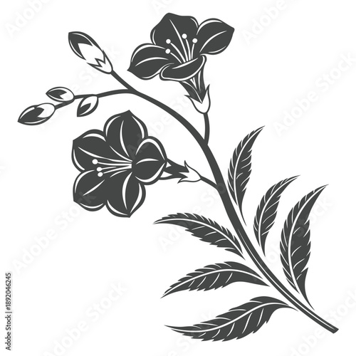 flower, blossom, botanical, herbal, illustration, stylised, flower petals, stamen, bud, leaf, nature, plant, art, flora, garden, wildflower, vector, decorative, aesthetic, bloom, tree branch, foliage, elegant, radiant, vibrant, symmetric, veined, serrated, blue