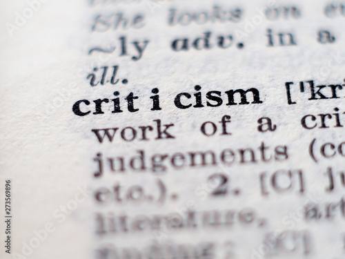 Dictionary definition of word criticism. Selective focus.