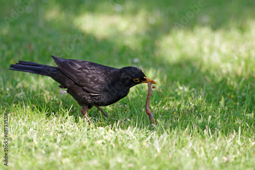 blackbird, earthworm, male, close-up view, vogel, grass, black, grass, food, garden, game, fauna, songbird, beak, feather, plumage, ground, earth, spring, sun, outside, animal, nature, green, park, ornithology, bird, worm, wildlife, bird