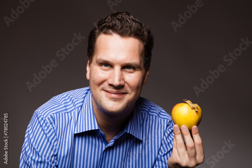 diet, man, male, fruit, healthy, care, body, health, nourishment, grey, happy, dark, holding, young, food, eat, apple, smiling, copy space, blank