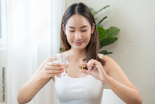 Dietary supplement, asian young woman, girl hand holding fish oil pills, drugs medical, take or eat vitamin for treatment skin, hair and nail strengthen with glass of water at home. Healthcare concept