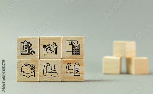 dietitian, visit, weight, loss, concept, lifestyle, improve, change, eat, habit, feeling better, quality, life, build, strength, protein, nourishment, vitamin, diet, plan, supplement, wooden, box, symbol, icon, background