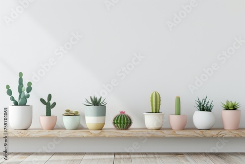 different cacti in simple colored pots stand on wooden shelf, the wall is white; wall with empty space