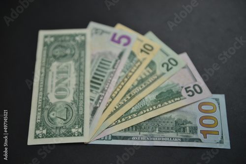 Different denominations of US Dollar bills from $1 to $100. Currency war concept, Global inflation, world economic crisis. Shallow depth of field. Selective focus.